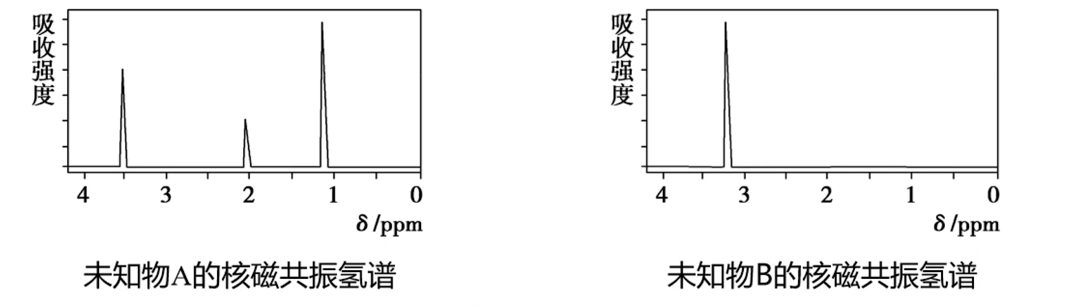 乙醇和二甲醚的核磁共振氢谱 A:CHA3CHA2OH(乙醇)分子中有 3 种处于不同化学环境的氢原子,对应的核磁共振氢谱图中只有 3 个峰,强度比为 3:1:2B:CHA3OCHA3(二甲醚)分子中的 6 个氢原子的化学环境相同,对应的核磁共振氢谱图中只有一个峰