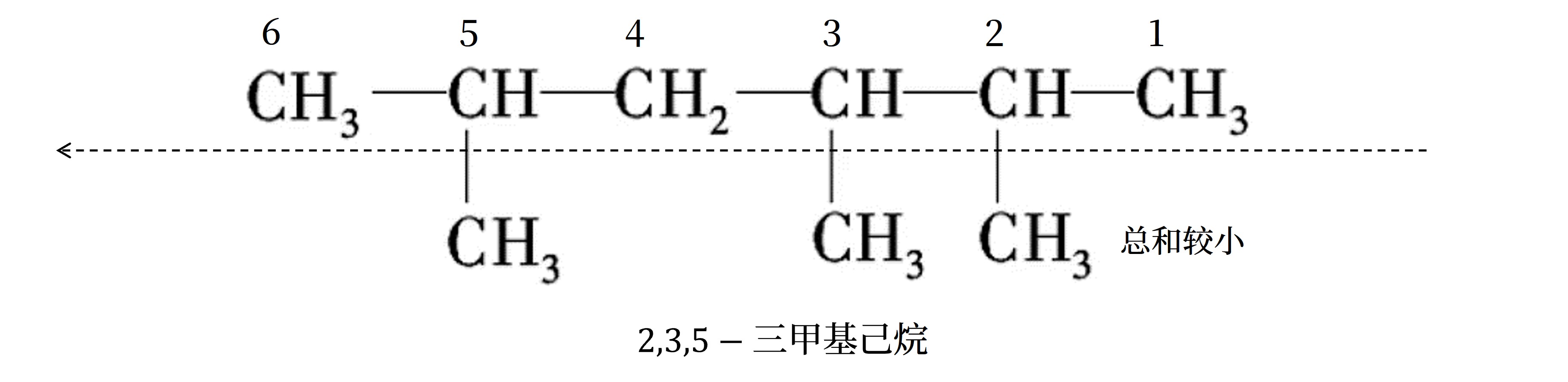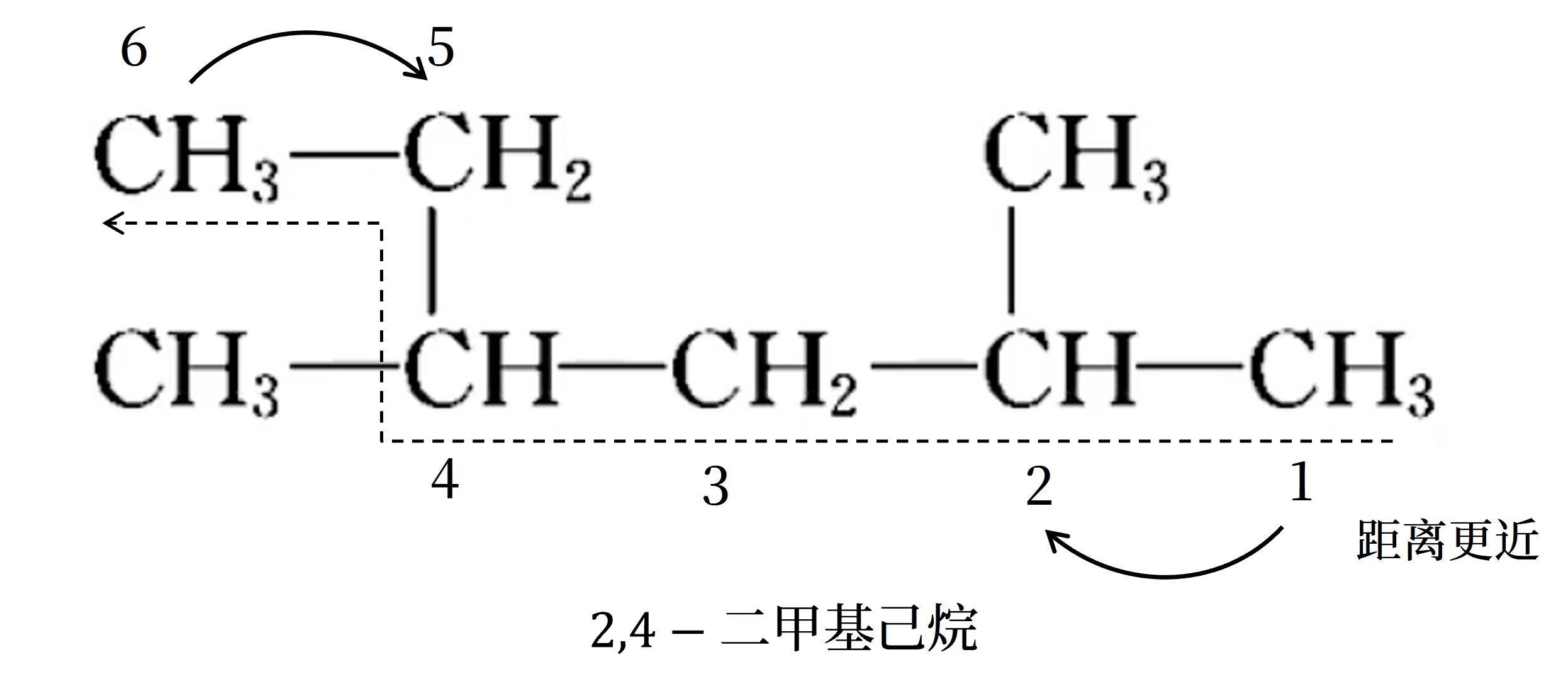 - 同「近」考虑「简」:有两个不同的支链,且分别处于距主链两端同近的位置则从 支链较简单的一端 开始编号