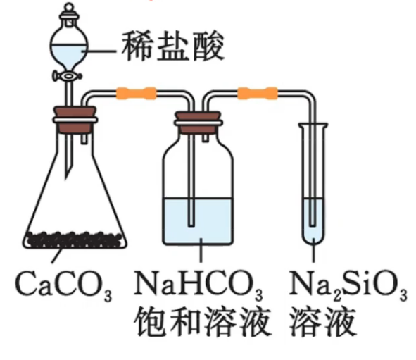 证明酸性:盐酸 > 碳酸 饱和溶液用于除去 中的 ,防止其进入试管中也反应生成硅酸而干扰实验 证明酸性:碳酸 > 硅酸 - 注意:该实验不能用于验证非金属性